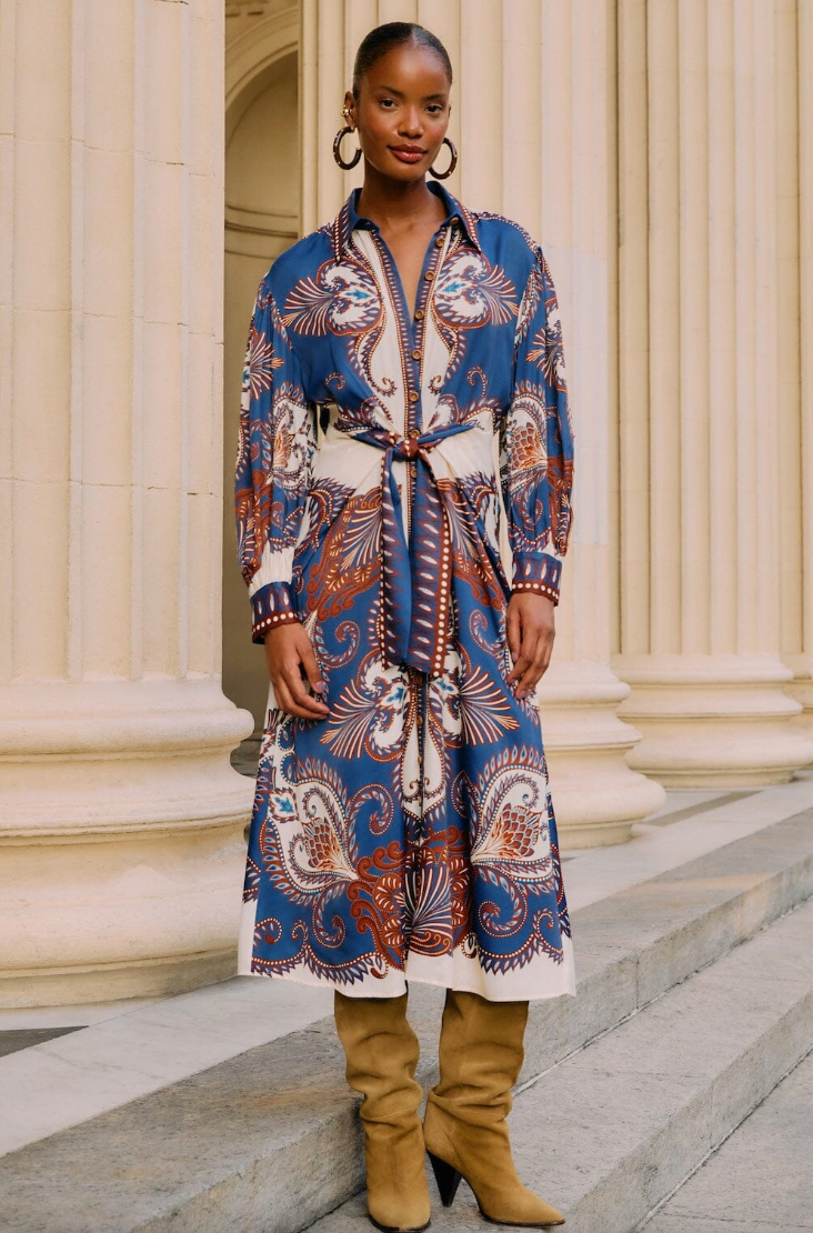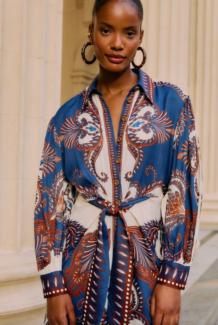 Wrapped in vibrant blue arabesque patterns, this midi dress from FARM Rio flows effortlessly with its soft Lenzing™ Ecovero™ viscose fabric. The collar neckline adds a touch of classic charm, while the playful silhouette dances with every step. Lightweight and breathable, this dress blends responsible craftsmanship with joyful elegance, inviting warmth and ease into your wardrobe with a distinct Brazilian flair.