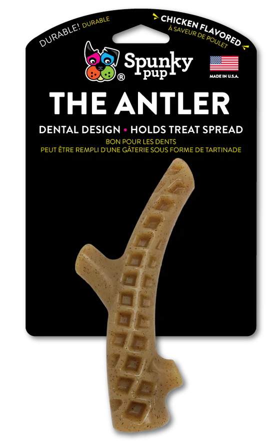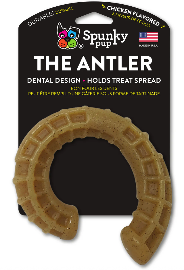 Made in USA! Spice up your pup's playtime with Spunky Pup's Nylon, Woodfilled, USA-Made Chew Toys! Don't worry about your pup overindulging—these tasty chew toys are made of super durable nylon infused with irresistible chicken flavor. With multiple shapes, sizes and textures, there's something for every dog. Load up the nooks and crannies with their favorite spread and let the fun times roll! A truly flavor-filled, durable chew delight!