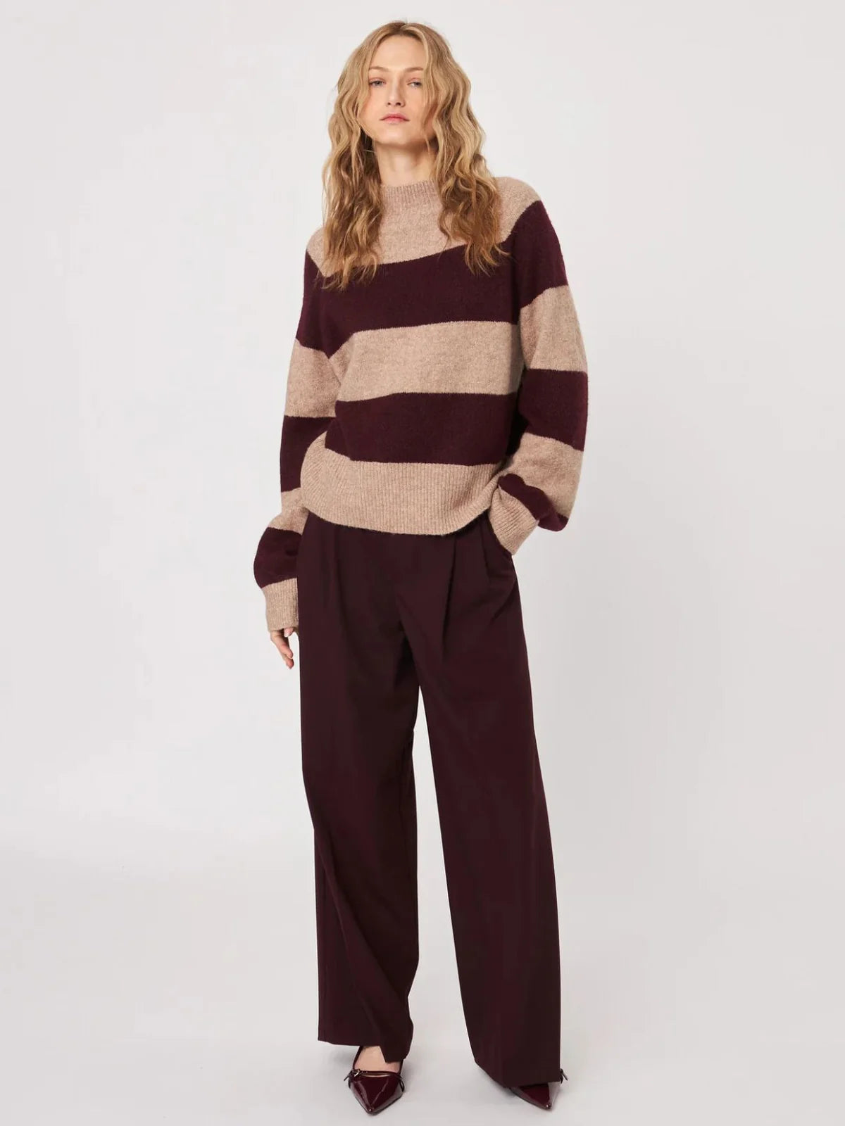 Bold and cozy, this oversized striped sweater brings effortless cool to your everyday style. Featuring wide horizontal stripes in rich burgundy and warm taupe, it’s crafted from a soft knit blend with a relaxed silhouette and dropped shoulders for maximum comfort.