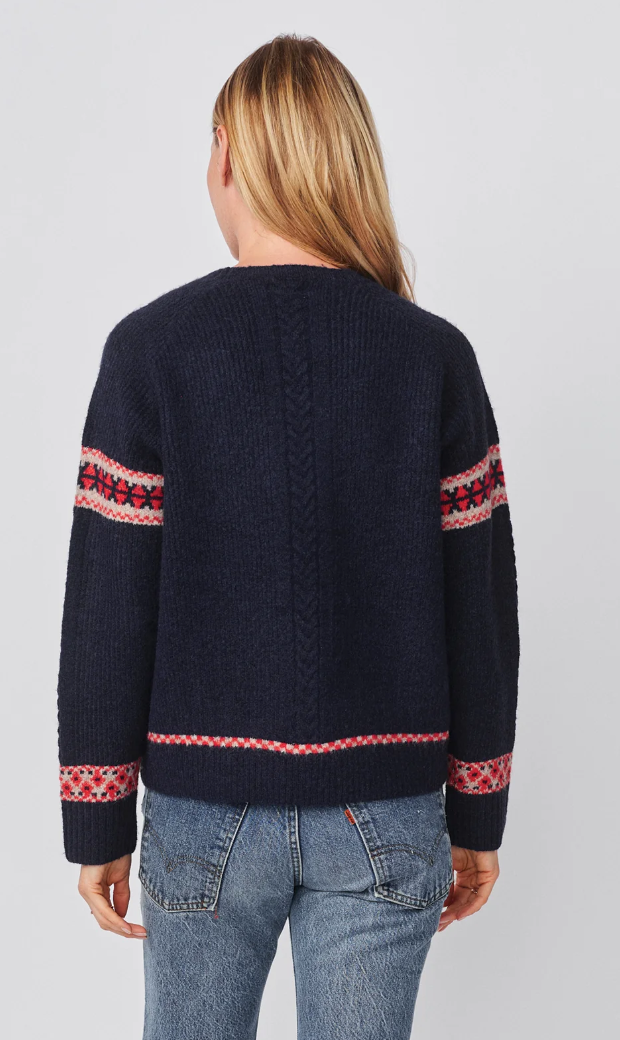 This navy sweater channels classic après-ski charm with bold red “SKI” lettering and Fair Isle-inspired patterns across the chest and sleeves. Crafted from a soft, textured knit, it brings a cozy yet playful touch to cold-weather days.